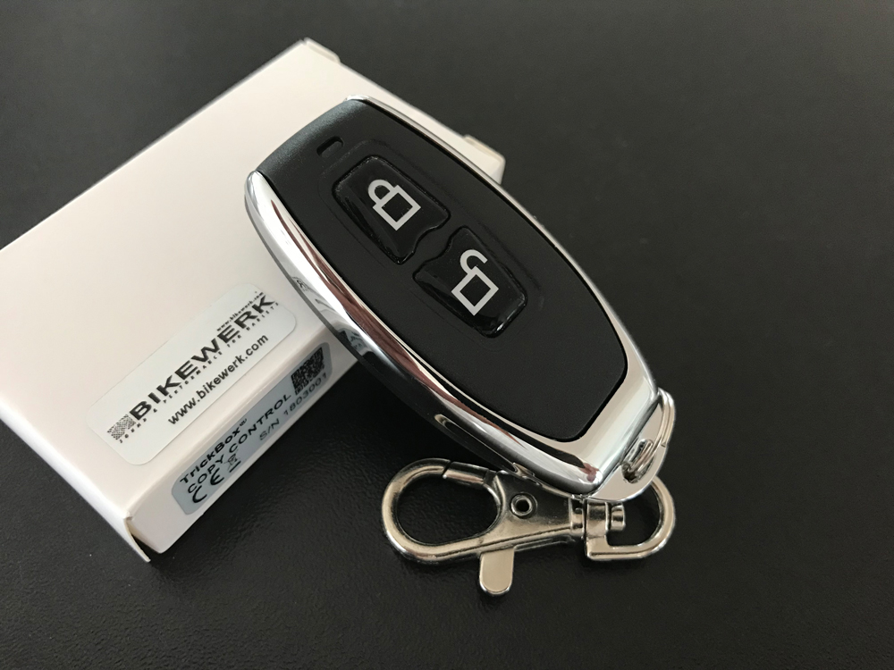 TrickBox REMOTE Funkfernbedienung passend für elektronisch klappengesteuerte Auspuffanlagen mit Soundswitch von KessTech® ESM 2 & ESM 3, Jekill & Hyde® BlackBox bis einschl. Bj. 2016. Achtung: Ein Betrieb, bzw. Einbau unserer BikeWerk TrickBox Produkte ist für den öffentlichen Straßenverkehr nicht zugelassen und nur für Rennzwecke, Showzwecke oder zum Einsatz auf abgesperrten, nicht öffentlichen Flächen geeignet. powered by BikeWerk.com